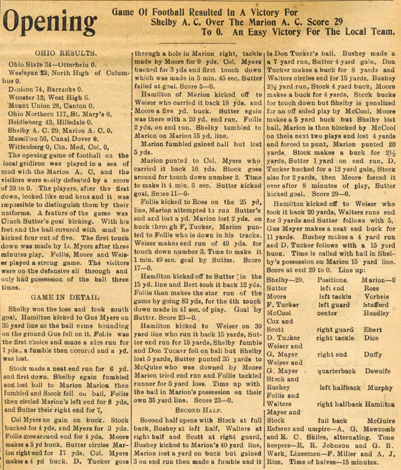| Shelby Athletic Club | 29 | Marion A. C. | 0 |